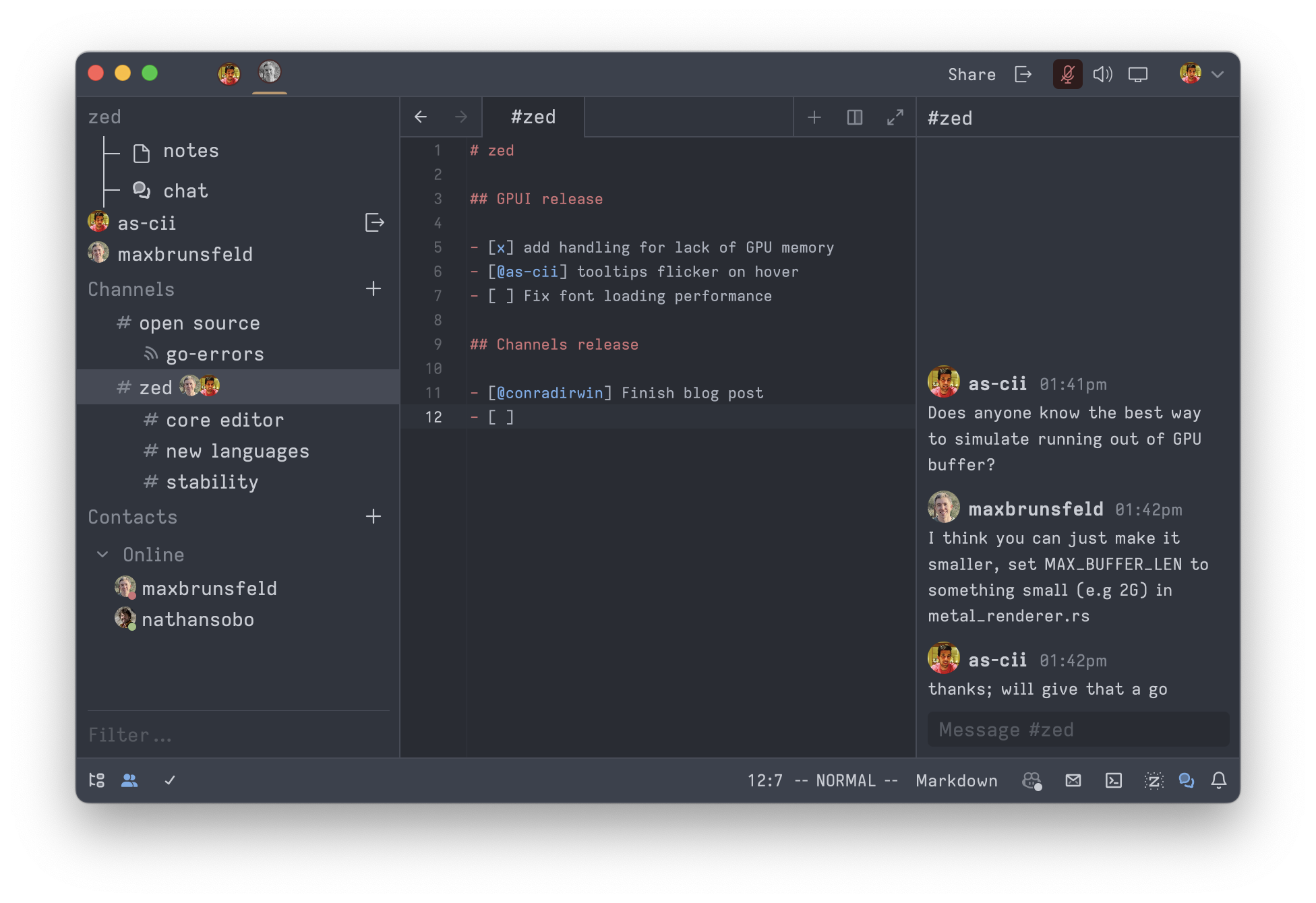 With today’s preview release, we’re launching a new feature called channels, which we have been using internally at Zed for the last few months.