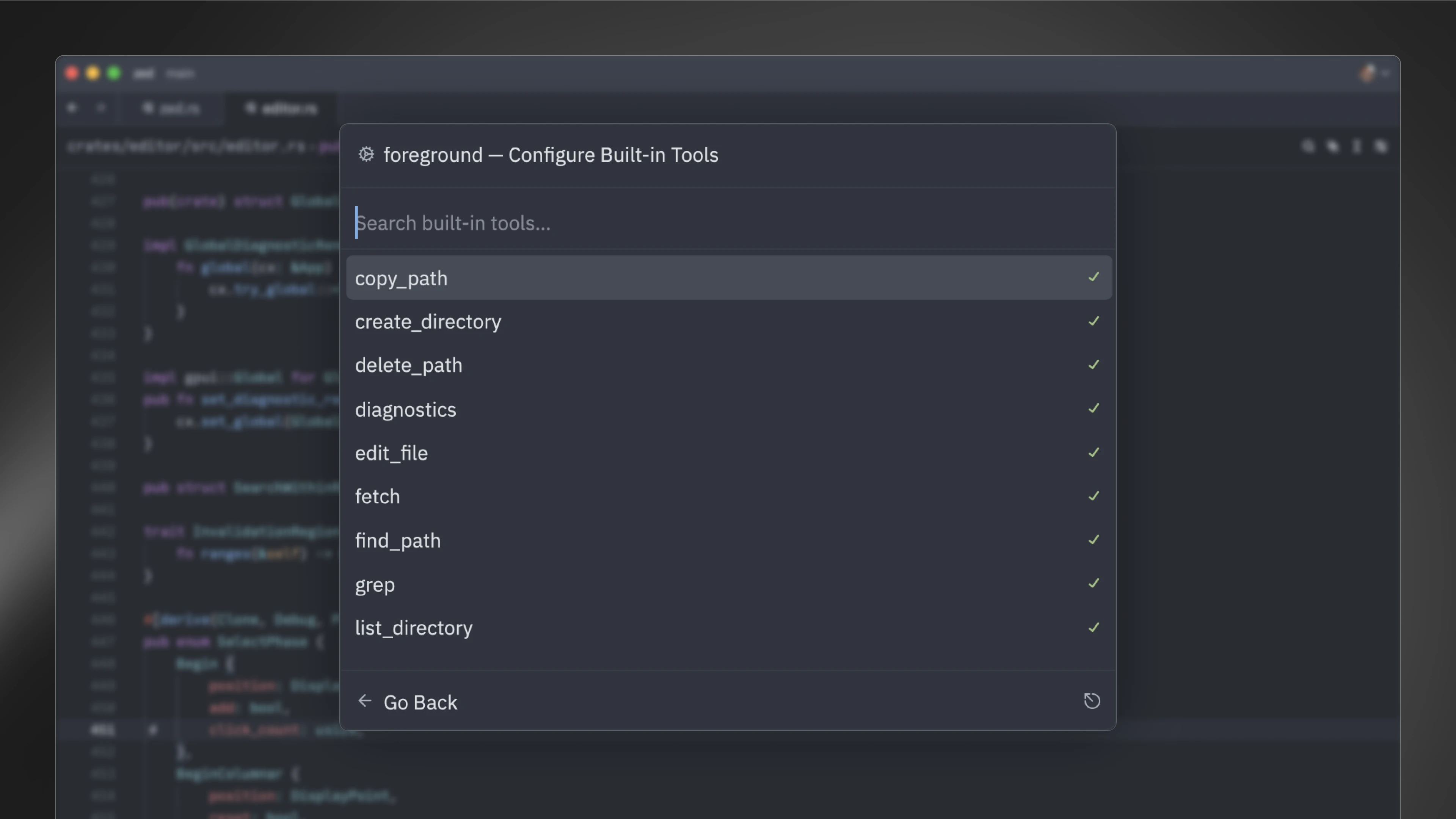 → The foreground profile has ALL of the built-in Zed tools set to active.