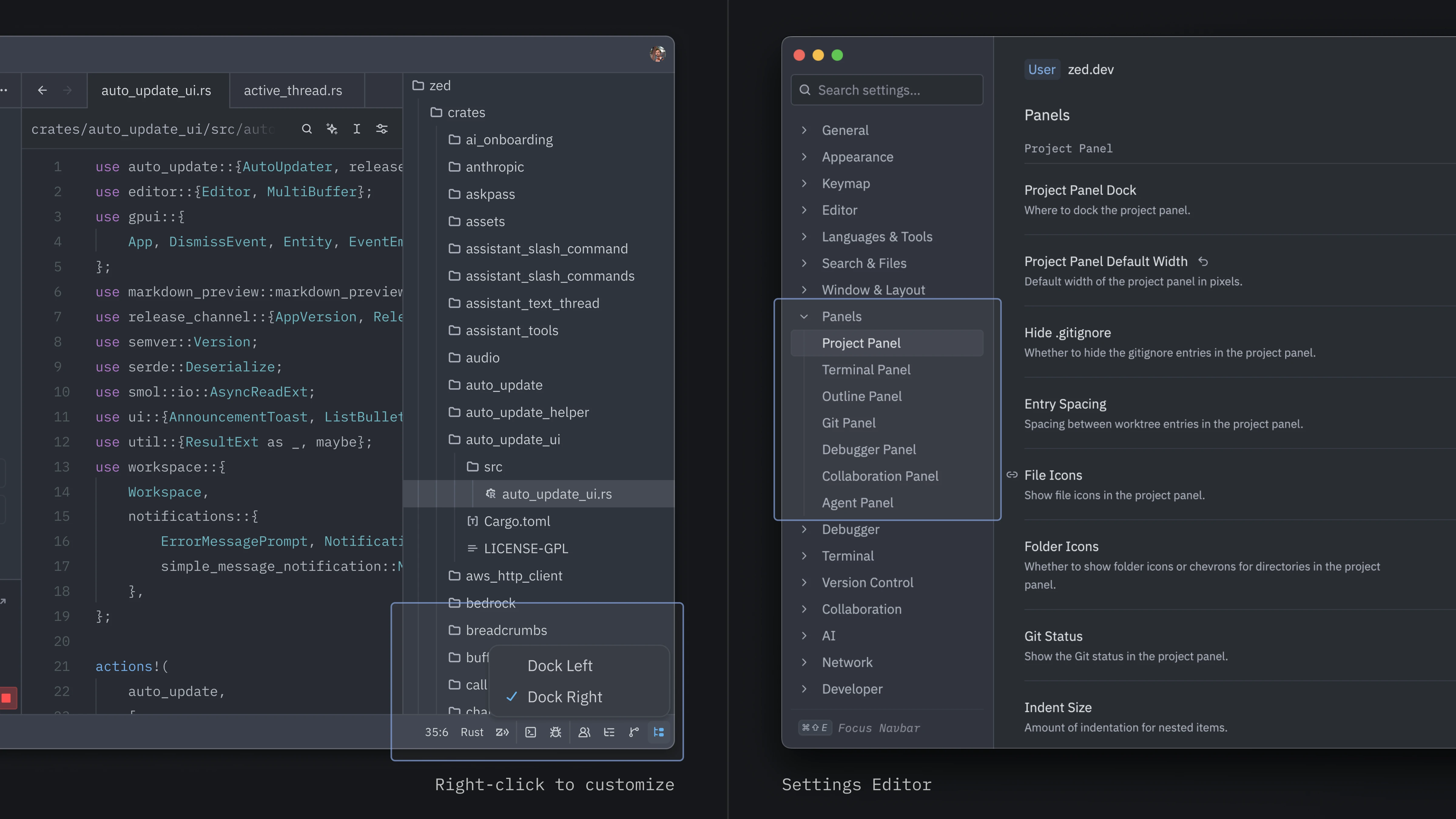 As the Threads Sidebar became our primary way of navigating a project, we reconsidered which panels should sit where. Threads now dock on the left by default, next to the Agent Panel, with the Project Panel and Git Panel on the right.
