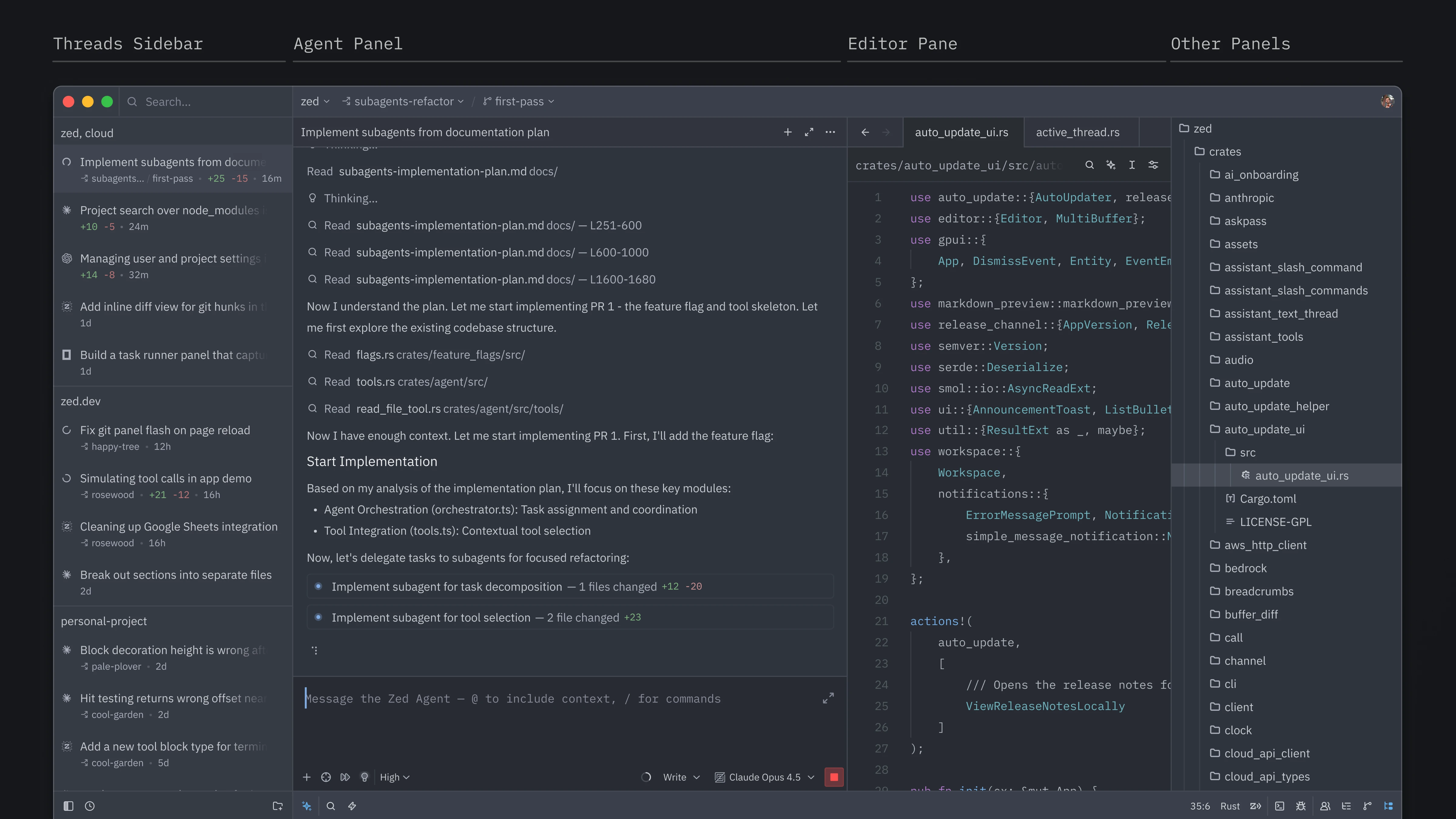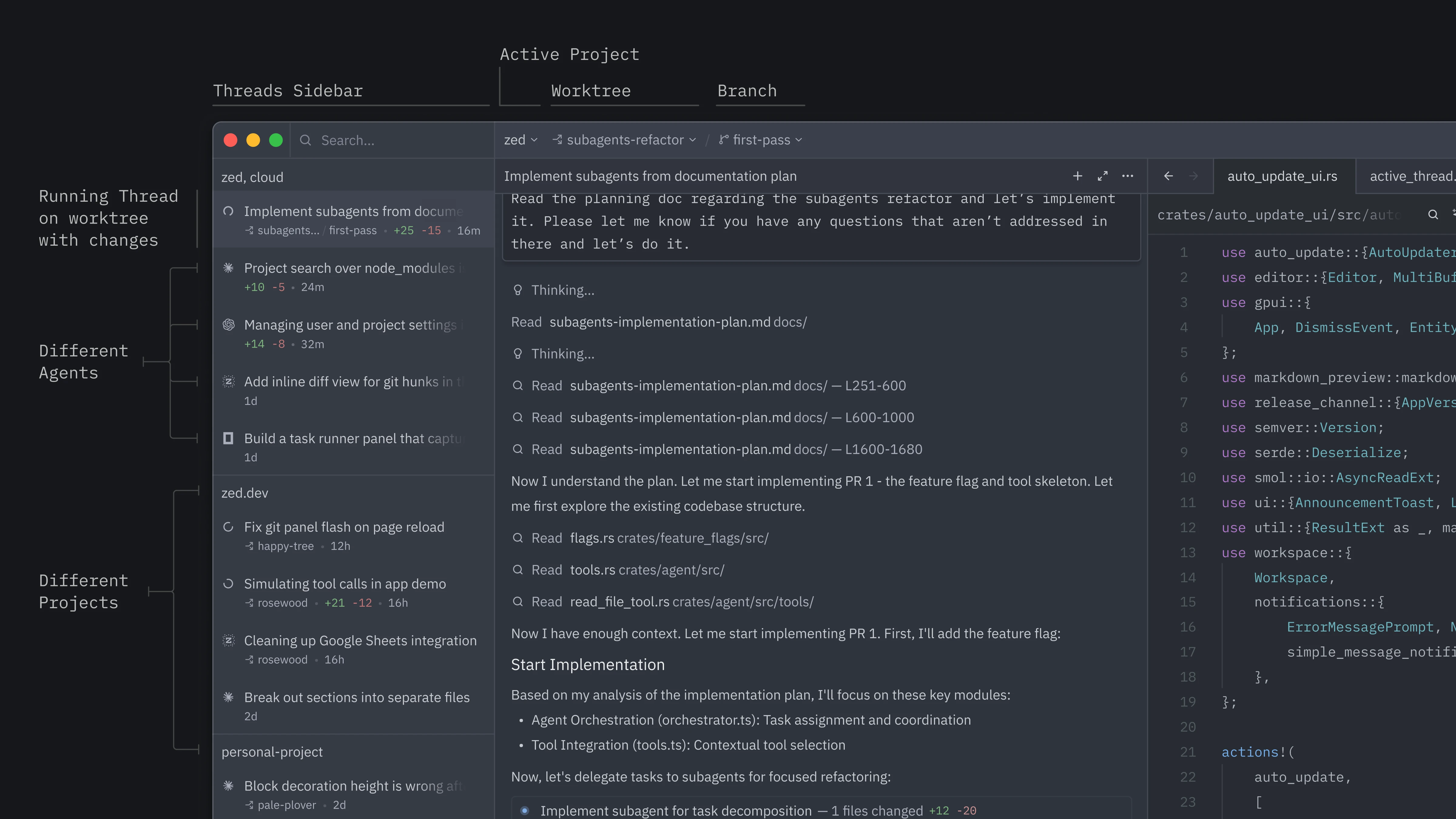 Zed now lets you orchestrate multiple agents, each running in parallel in the same window. The new Threads Sidebar lets you control exactly which folders and repositories agents can access, and lets you monitor threads as they run.