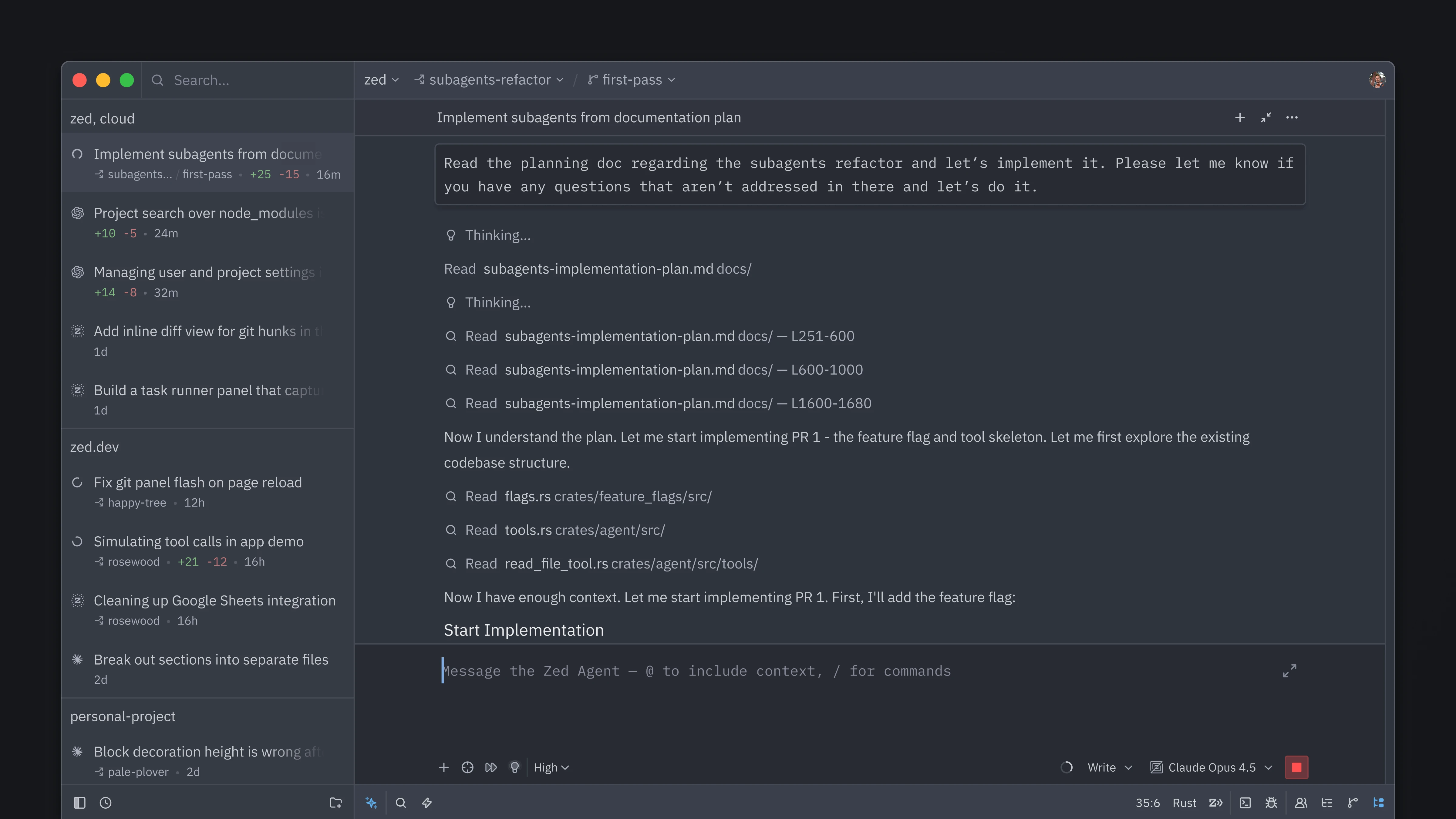 Parallel agents in Zed are built around that principle. Multi-agent orchestration isn't new, but we believe we've built a great experience for working with agents at scale. We spent days loading the system with hundreds of threads, refining rough edges and polishing corners that developers may never see. We went through several UX iterations and had countless hours of internal discussions. It took us longer, and we won't lie, it drove us a little crazy. But the result feels better for it, and it lets developers do more challenging things with agents, without sacrificing their craft.