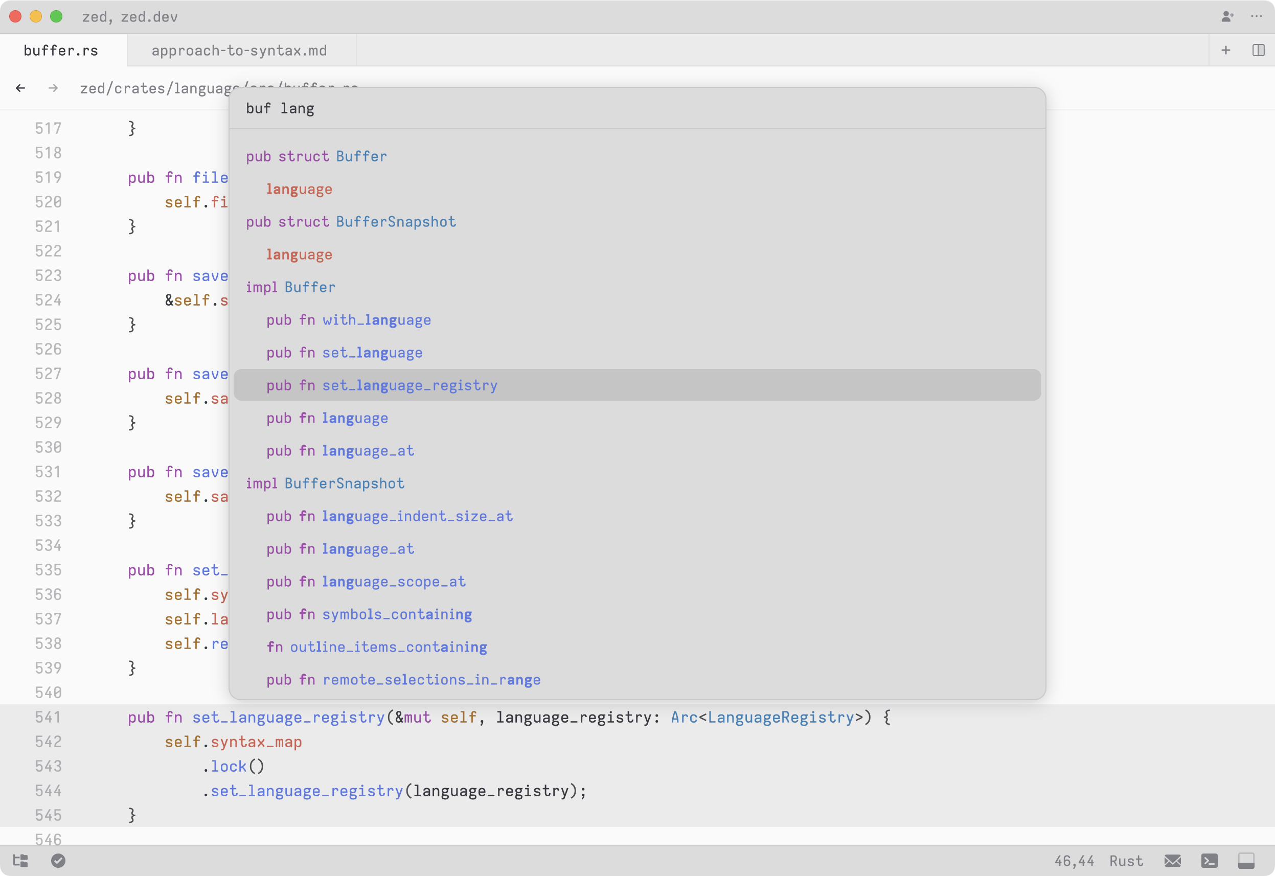 The outline modal is very powerful, because the fuzzy search operates on more than just one symbol name. For example, you can type a query like buf lang to quickly bring up all of the symbols that match lang and are within a parent symbol that matches buf. This would include methods like Buffer::set_language, and BufferSnapshot::language_at