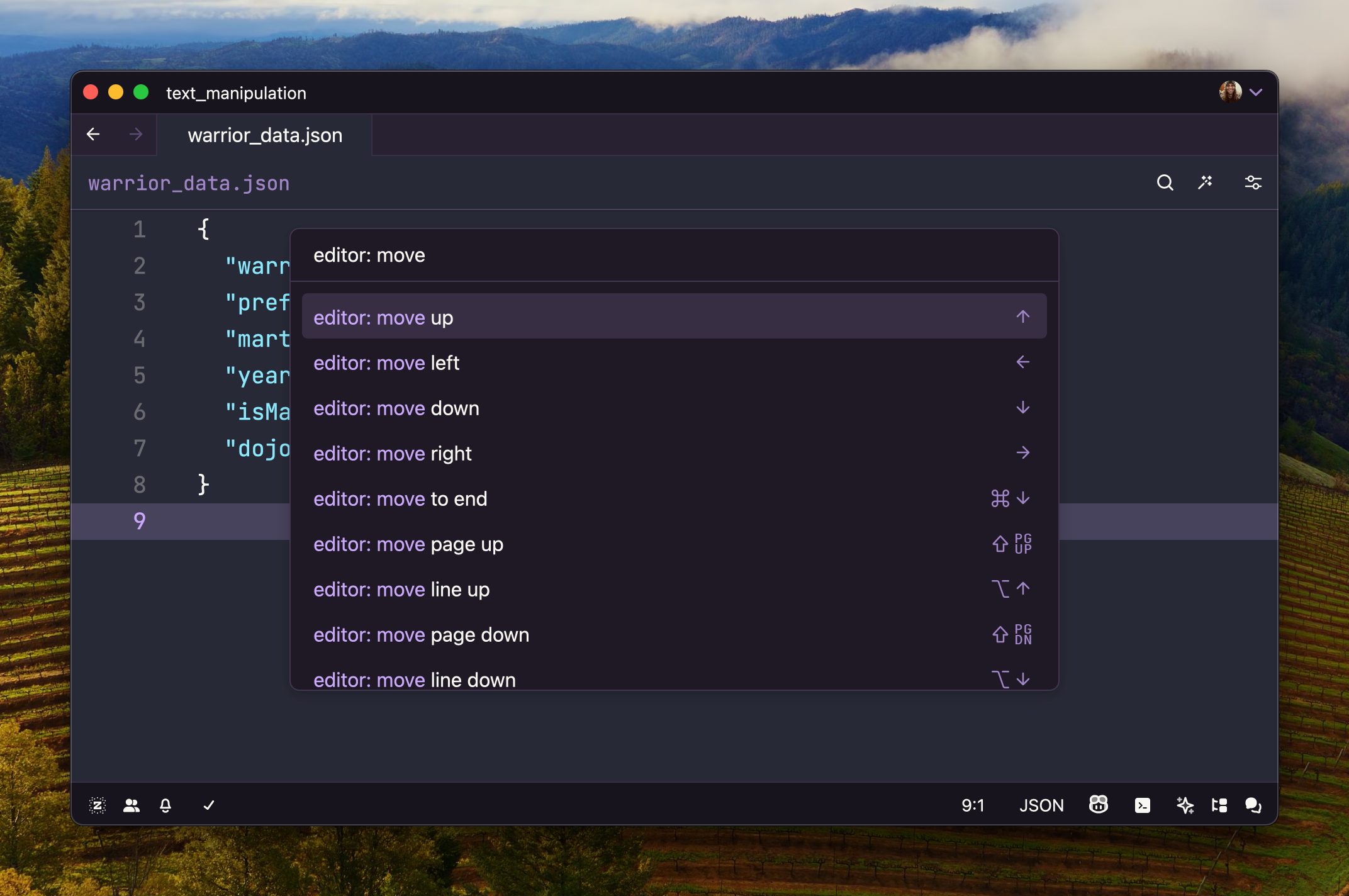Within the command palette, if you search for editor: move or editor: select, you are going to find heaps of commands - commands for jumping to the beginning of a file, the end of a line, the start of a word, etc. You'll also see commands for selecting the next word, the next line, the next paragraph, etc. Learning all of these commands directly is both daunting and unnecessary. Instead, we'll focus on the learning the building blocks of cursor navigation and selection; these blocks can be intuitively combined to achieve more complex movements or selections.