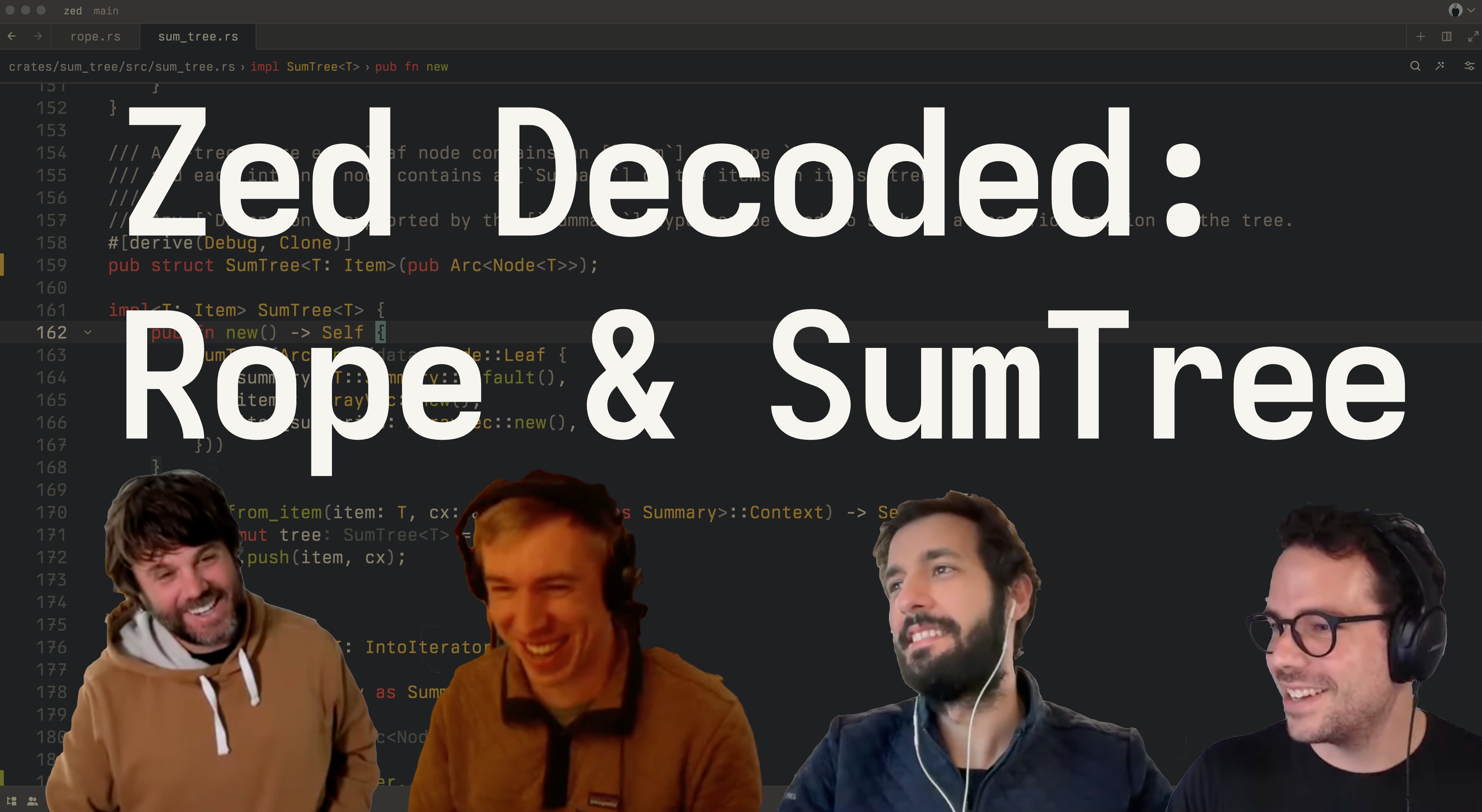 This post comes with a 1hr companion video, in which Thorsten, Nathan, Antonio, and Max use Zed to look at how Zed uses the Rope and SumTree types. It's a loose conversation in which we write and read a lot of code to understand how the rope in Zed works and is implemented.