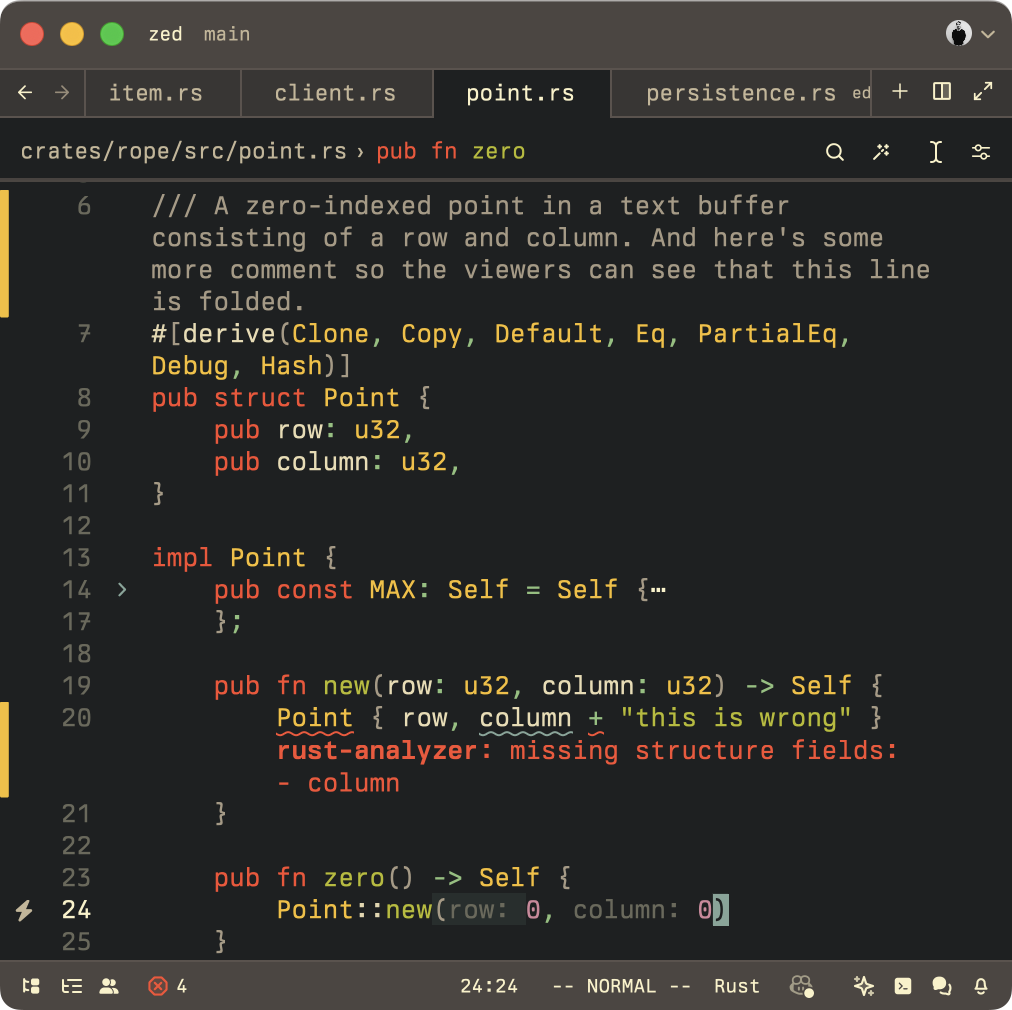 In that screenshot, you can see that line 6 is soft-wrapping and taking up more than a single line. The definition of Point::MAX is folded. A block is showing a diagnostic error. And in the zero() method, where the cursor resides, there are two inlay hints to the left of the cursor.