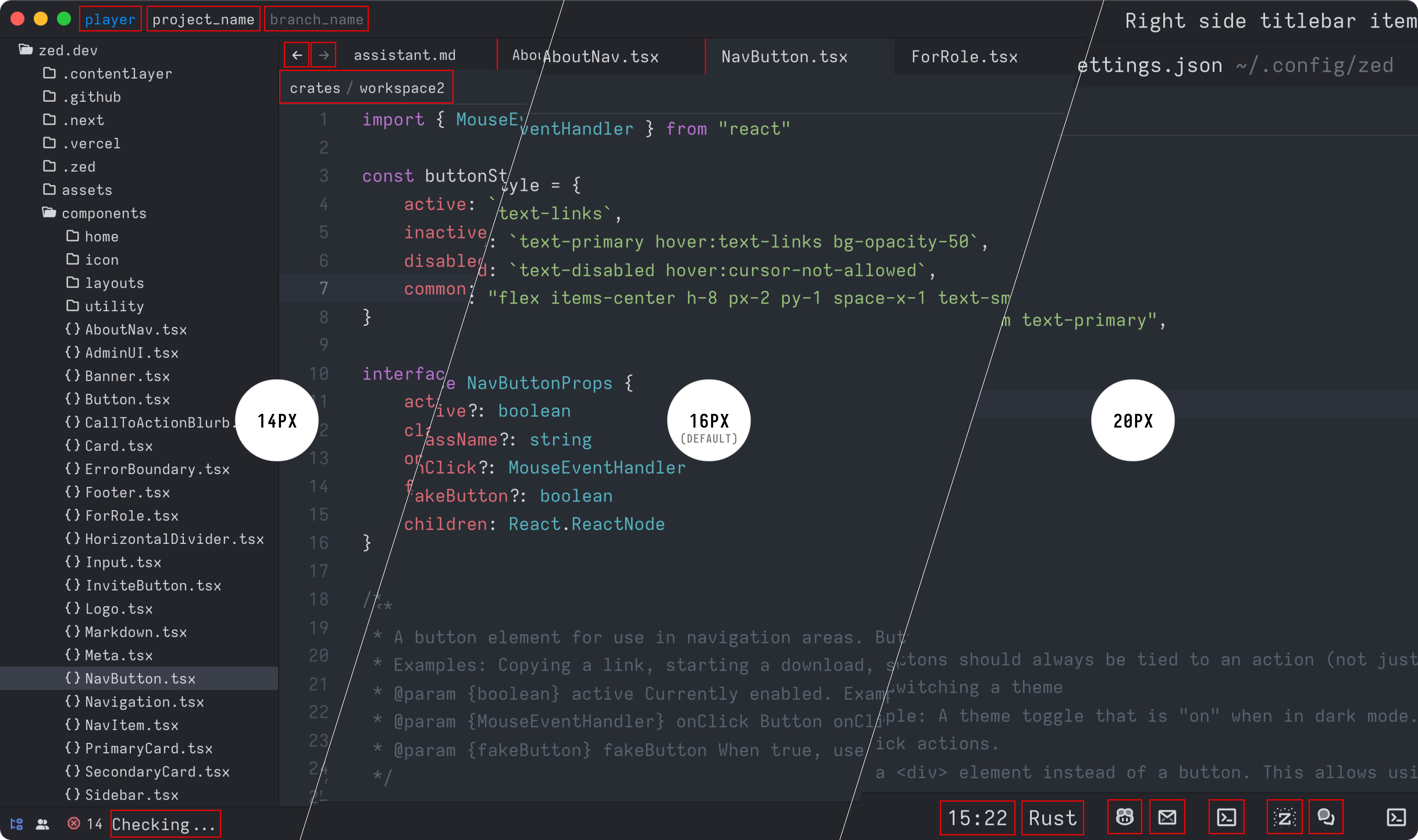 Above is an example of ui_font_size set to 14px, 16px, and 20px. UI scale can be set independently of buffer_font_size, so you can have a large UI with a small font size, or vice versa if desired.