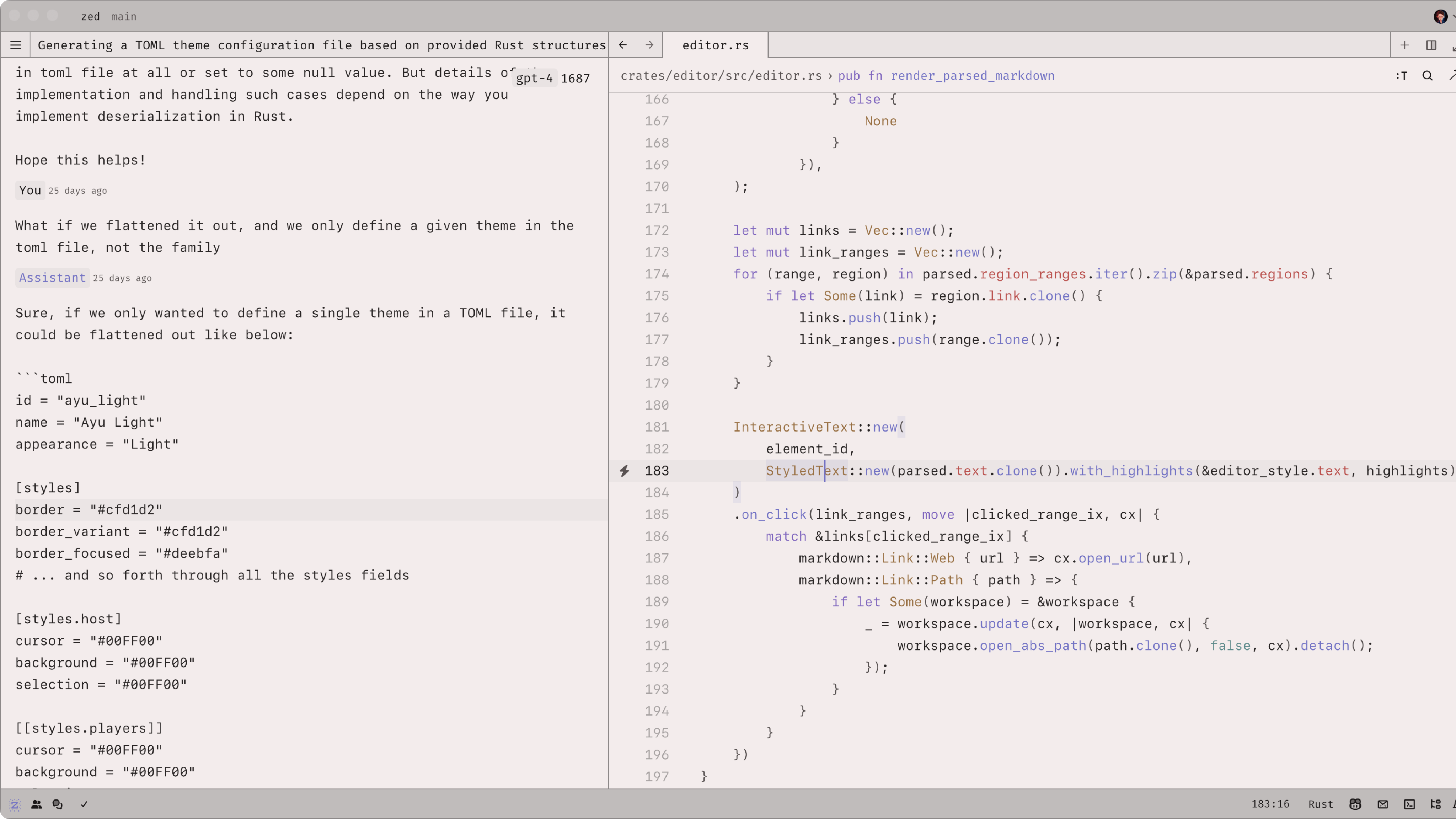 Zed ships with a number of common editor themes. Themes will continue to be added to and improved.
