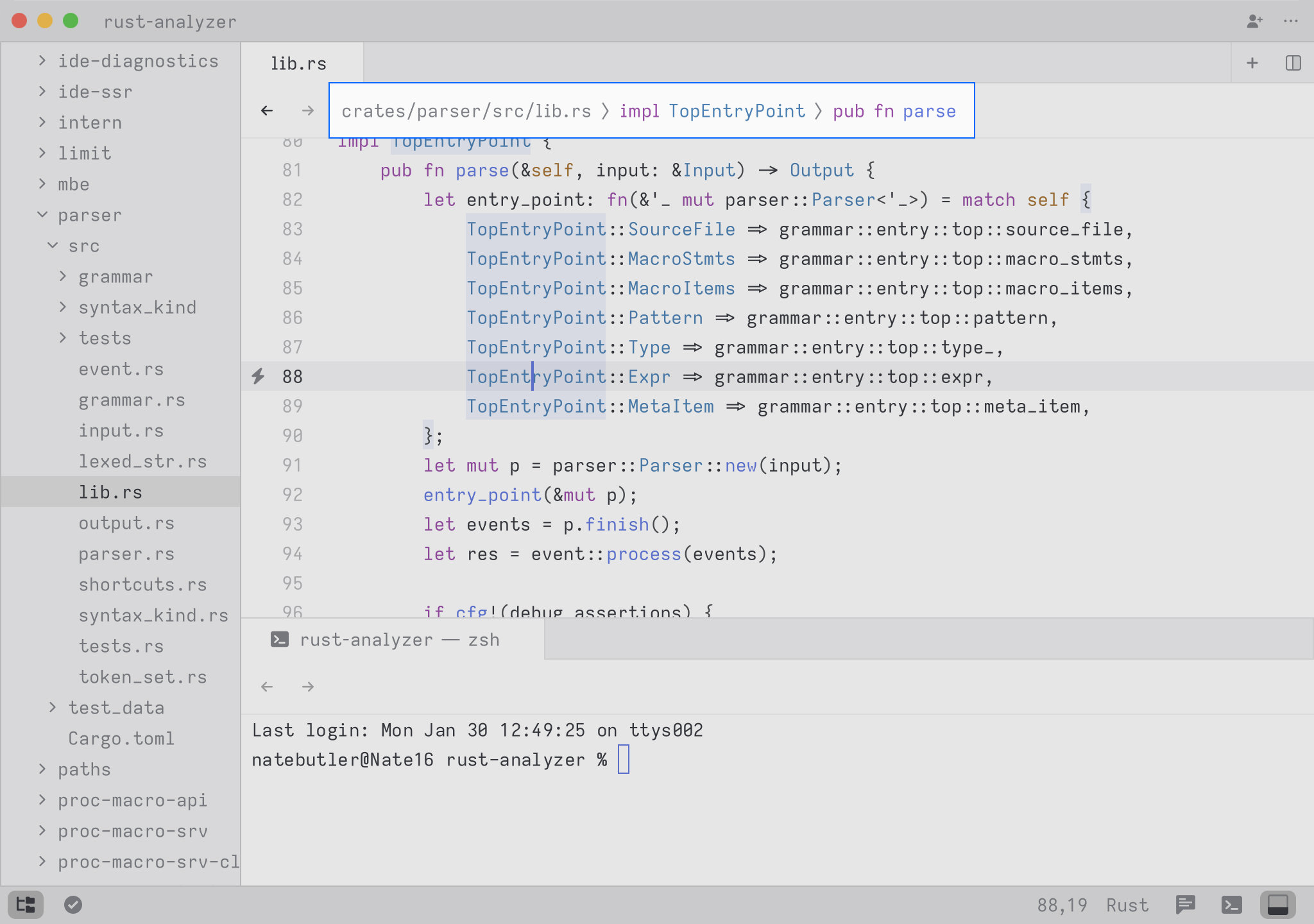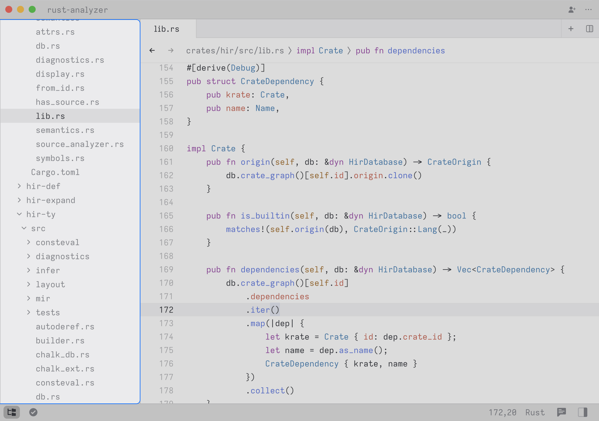 It can be a good way to understand the layout of a file, which can be helpful when browsing code or when deciding where to insert a new definition. When you first open the outline view, Zed always highlights the entry closest to your current location within the file.