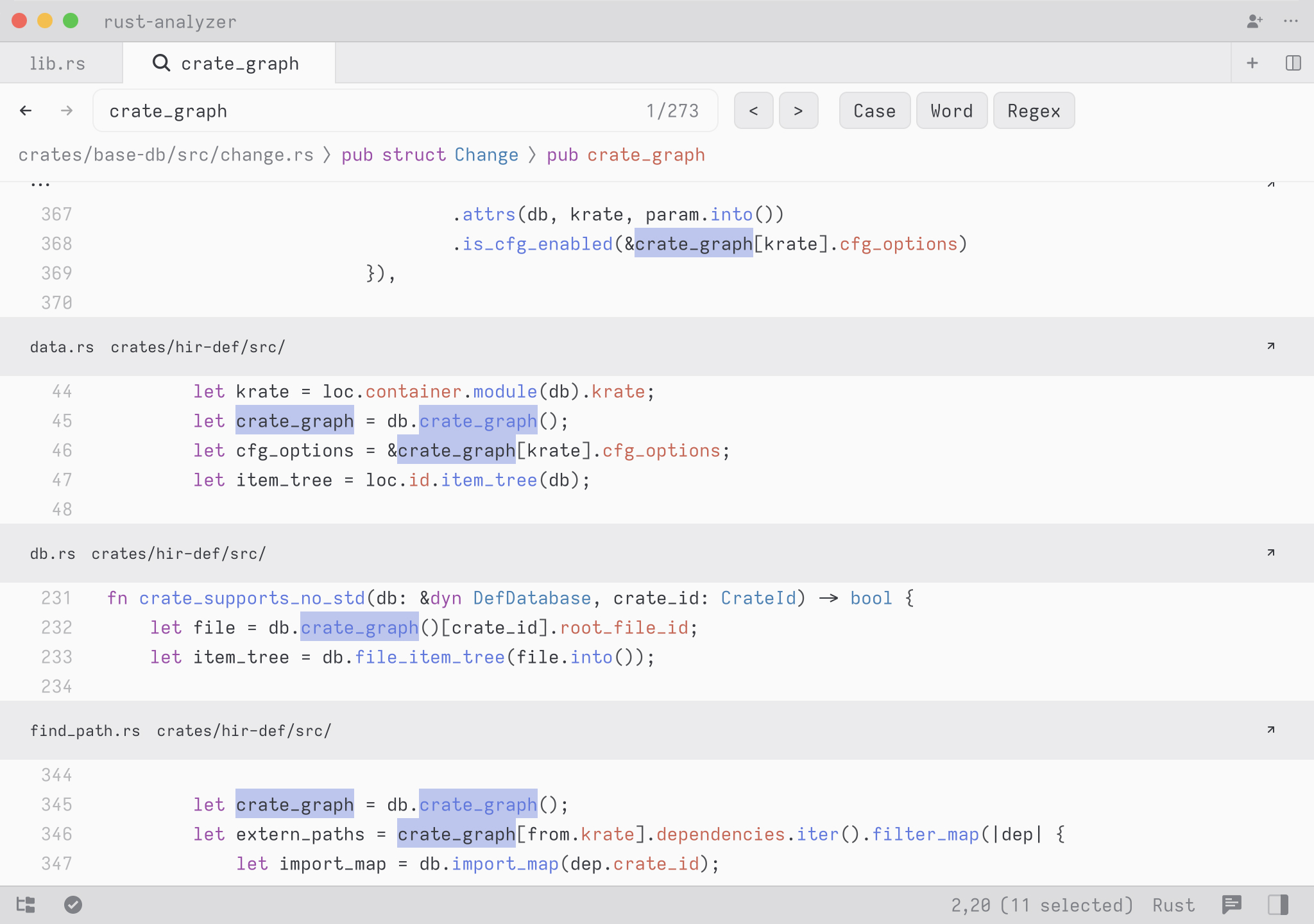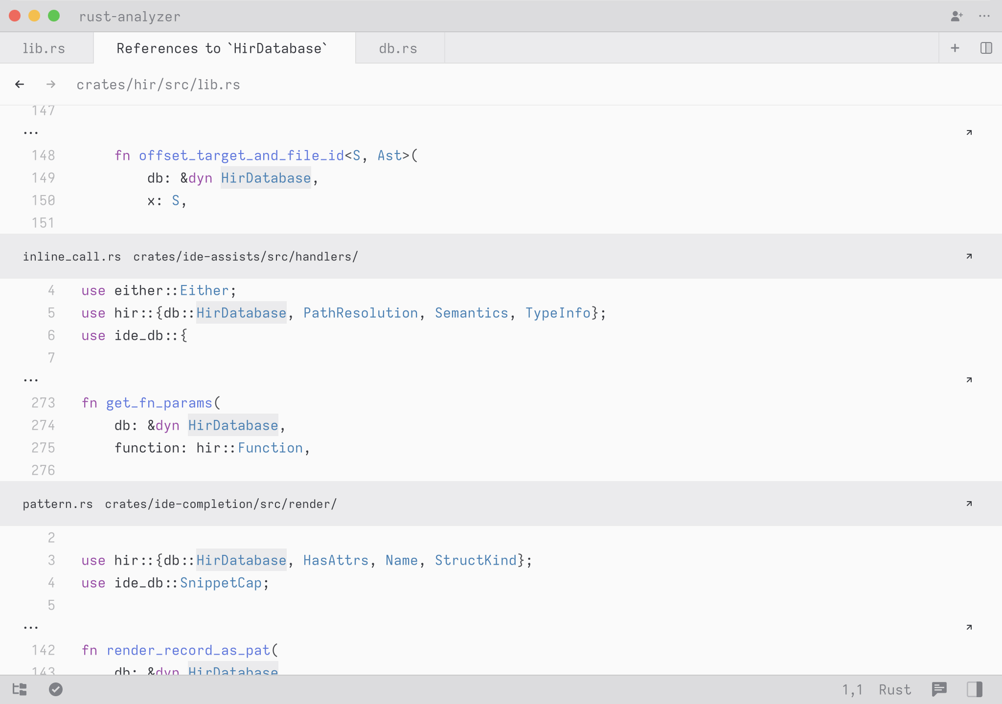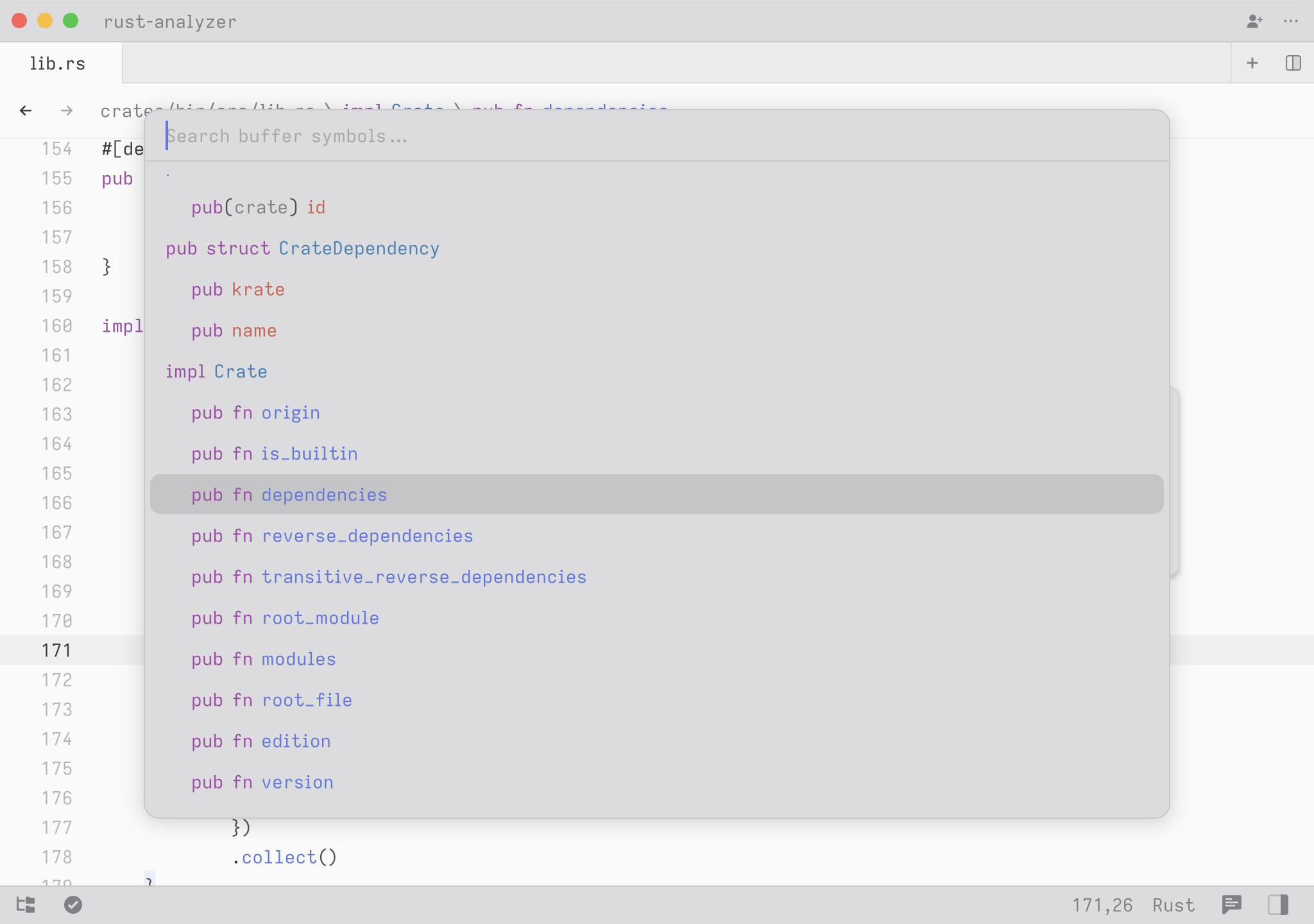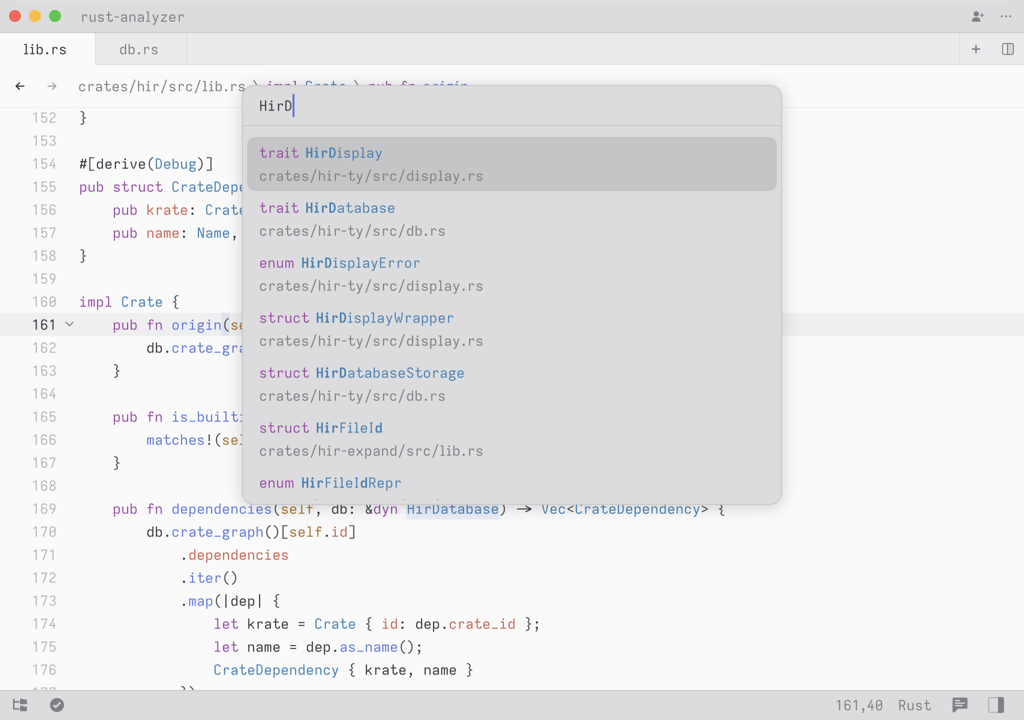 A cool hidden feature is that when your query contains a space, we expand the search to match on contextual keywords. So in Rust, you could type select to search for any definition whose names matches the word select. But you could type pub fn select to search all public methods or functions matching the word select. You could also type pub fn to simply see all public functions or struct to see all struct definitions.