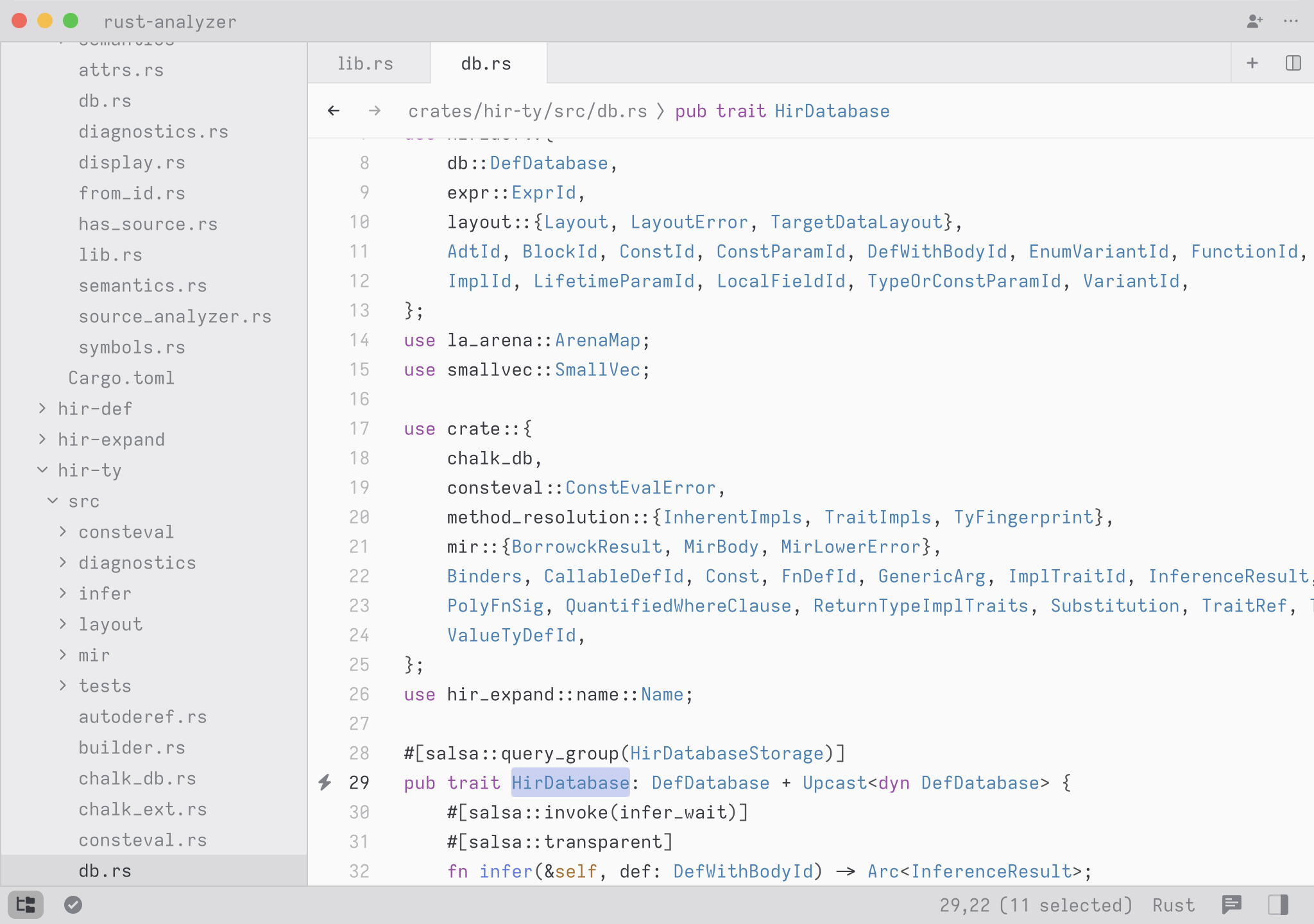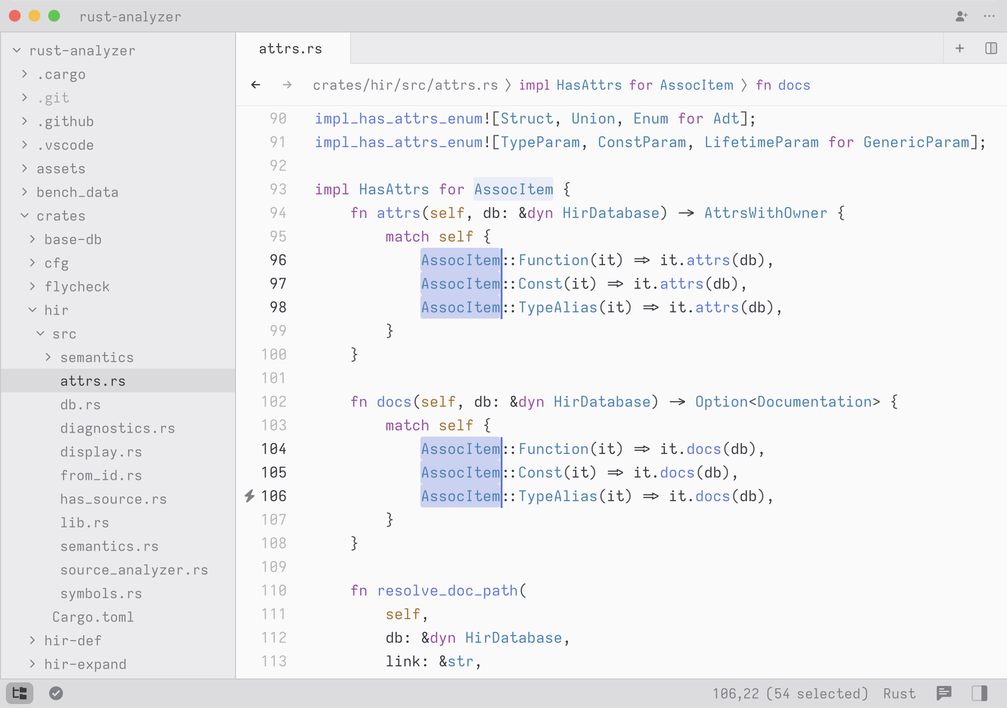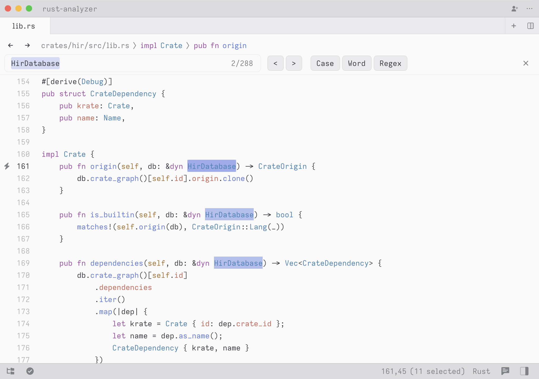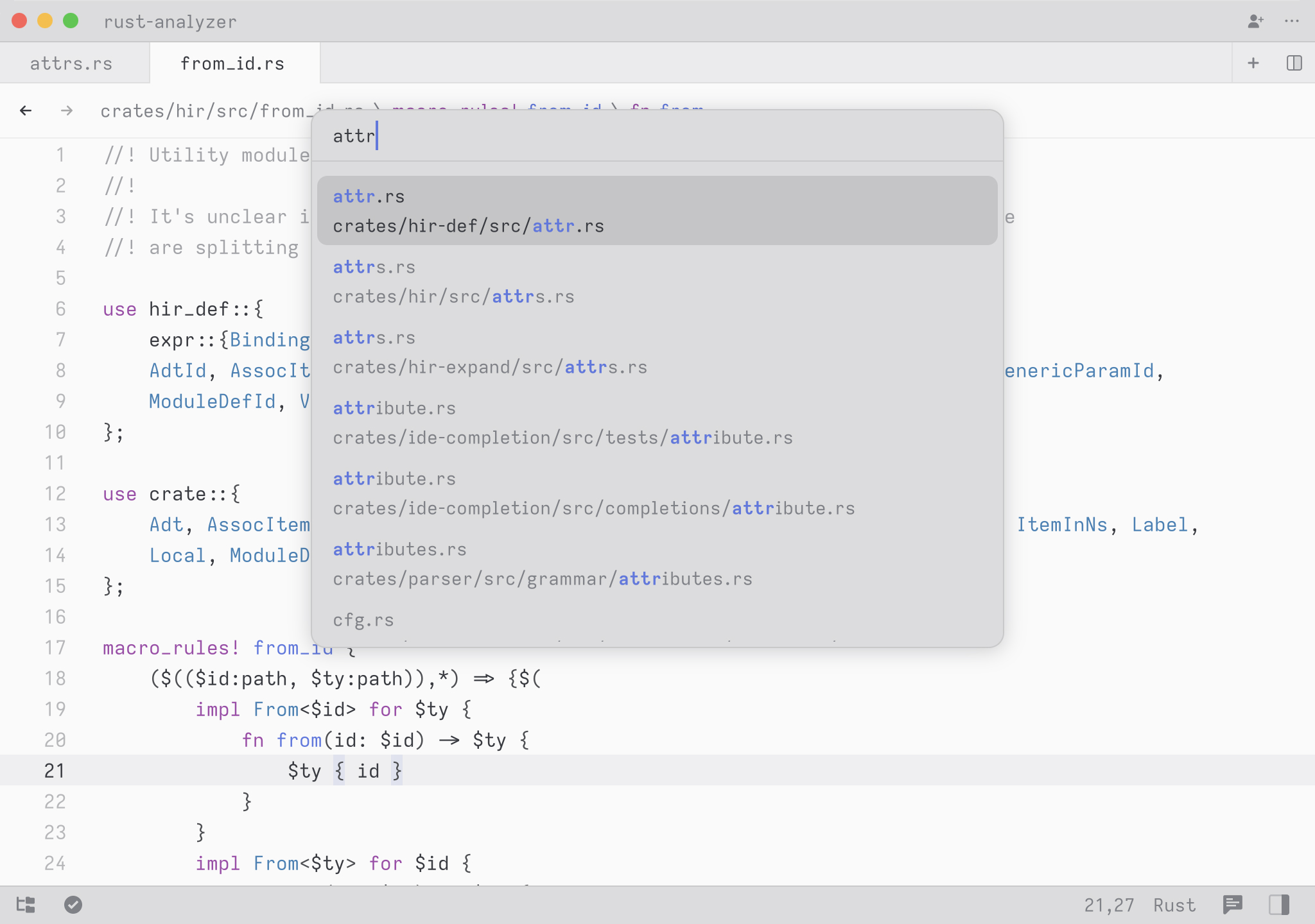 A cool hidden feature is that when your query contains a space, we expand the search to match on contextual keywords. So in Rust, you could type select to search for any definition whose names matches the word select. But you could type pub fn select to search all public methods or functions matching the word select. You could also type pub fn to simply see all public functions or struct to see all struct definitions.