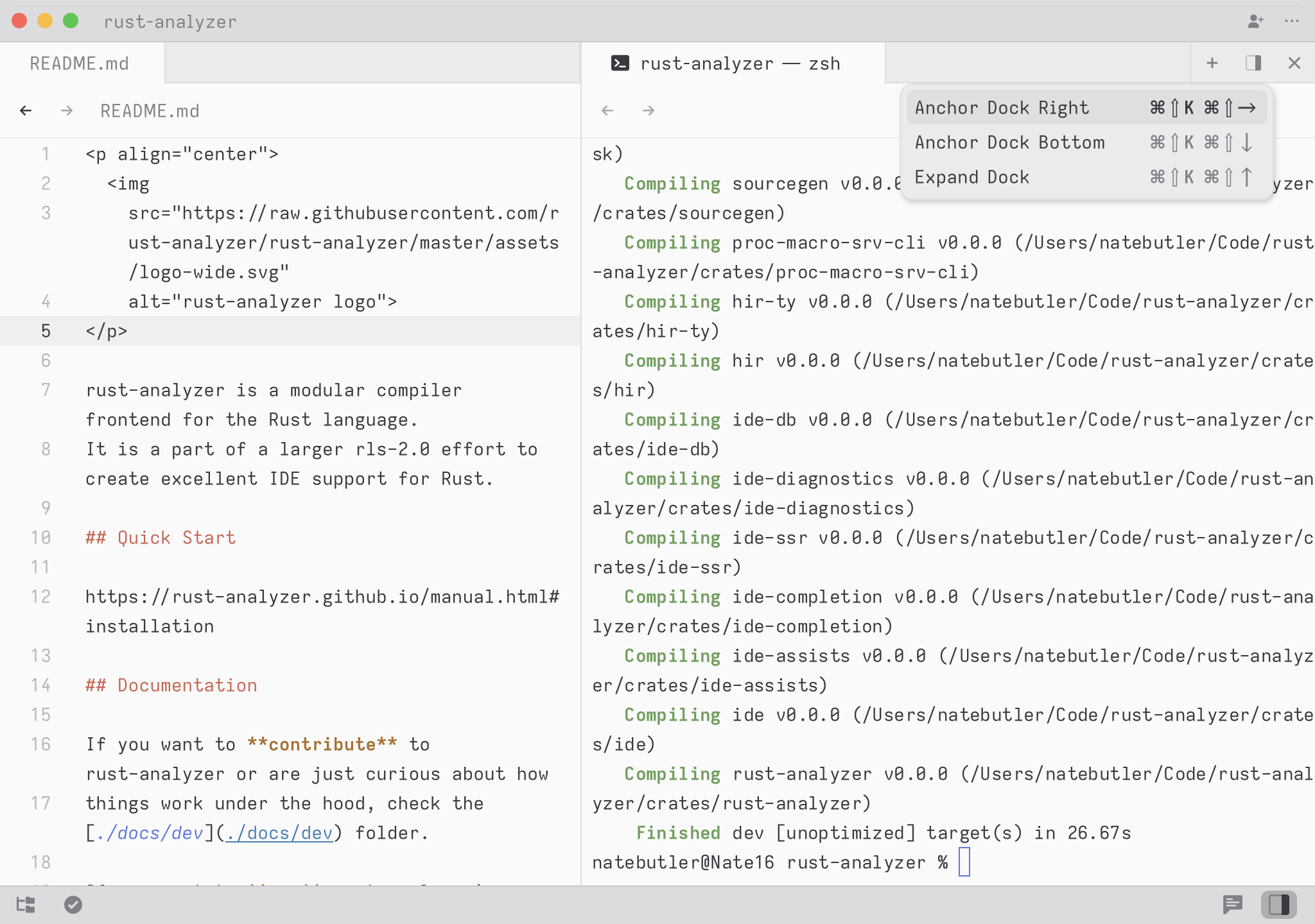 The dock may be anchored to the right, bottom, and as a modal via the dock anchor menu in the top right of its pane or by the associated key bindings.