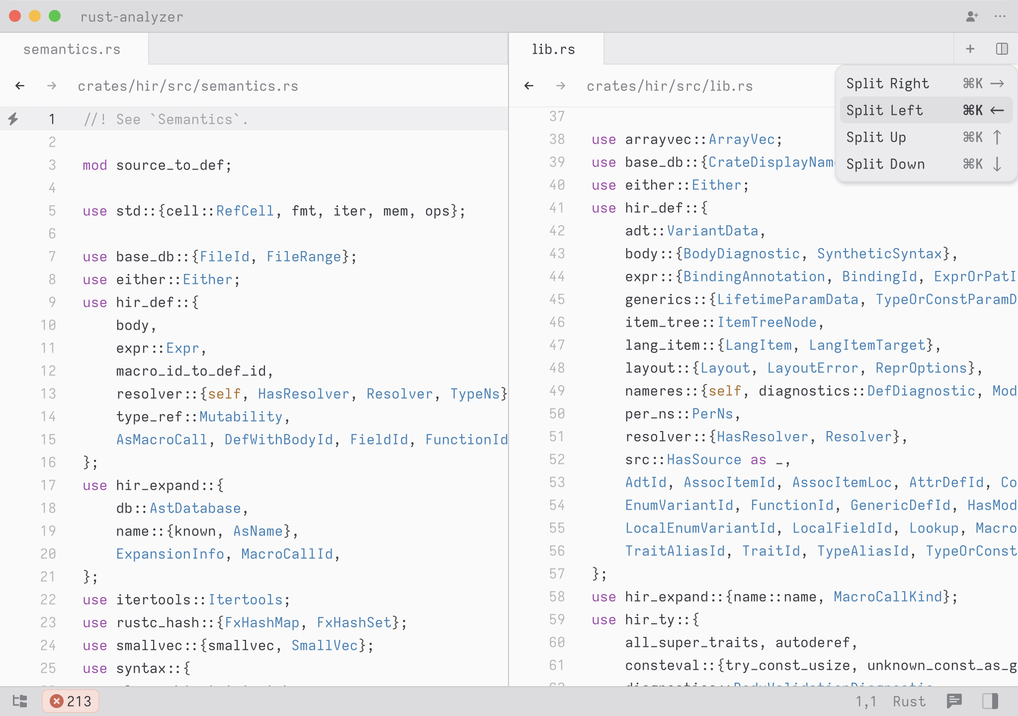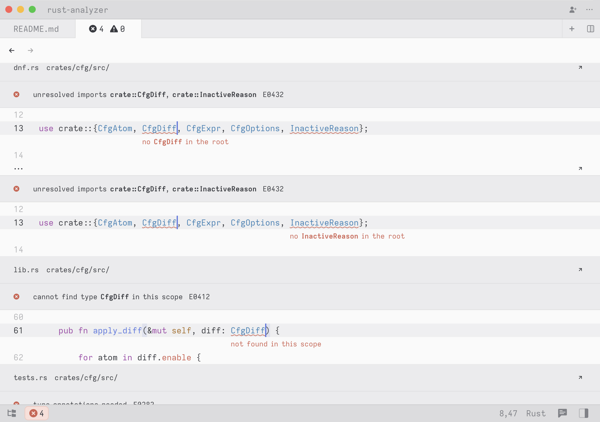 This multi-buffer contains an excerpt for every error in your project, and its contents will update as you fix errors and save. Sometimes the language server reports multiple errors for the same piece of code.