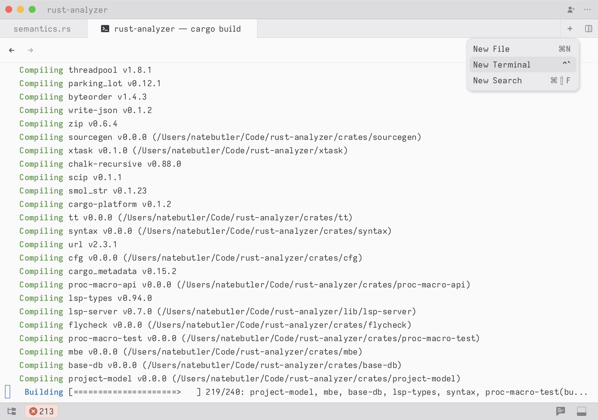 Zed displays the number of errors and warnings that exist across your entire project in the status bar at the lower left corner of the workspace. If you click this indicator or press cmd-shift-M, you'll open the project diagnostics multi-buffer.