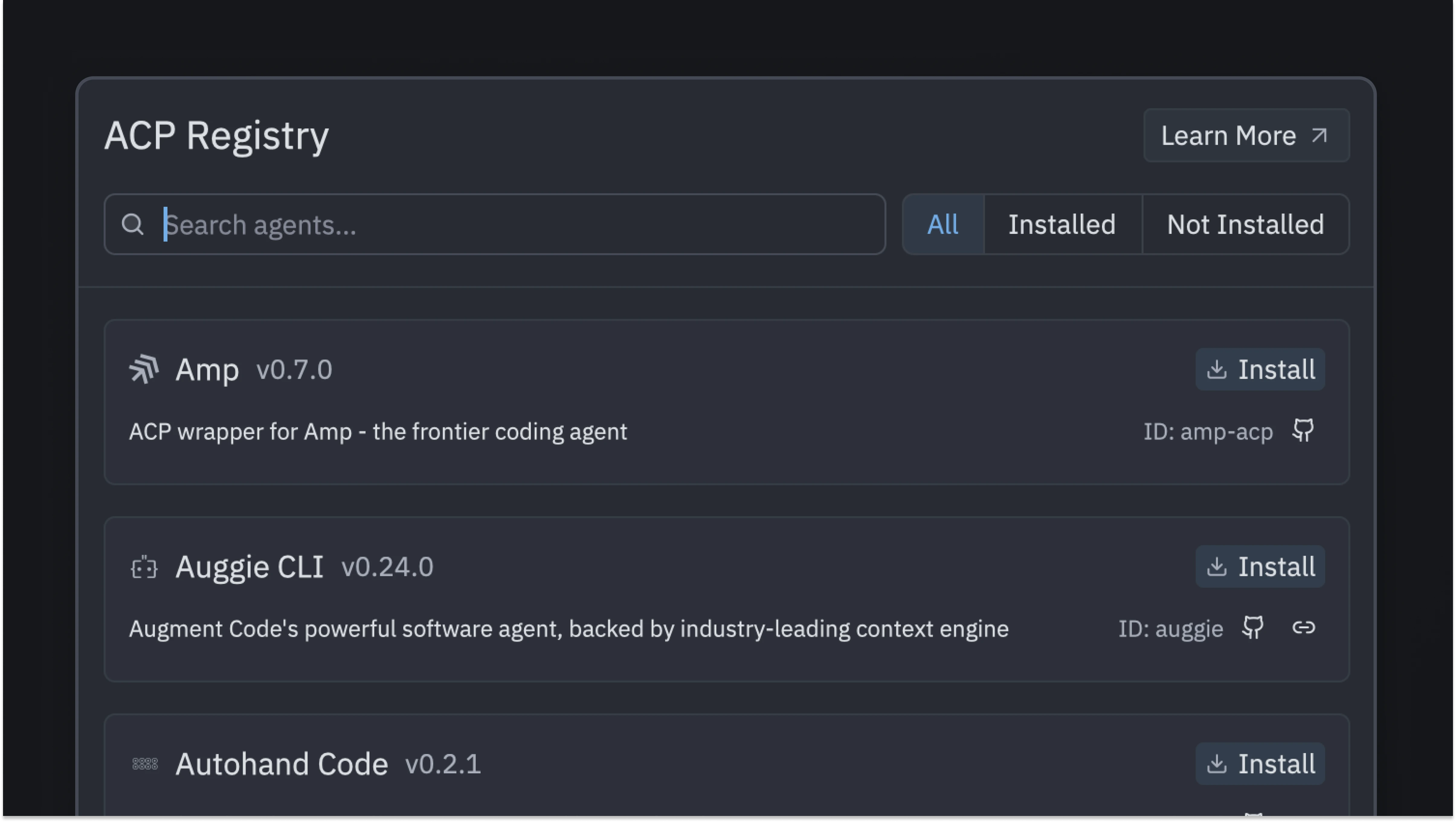 Experiment with different agents by exploring the full list available in the ACP registry.