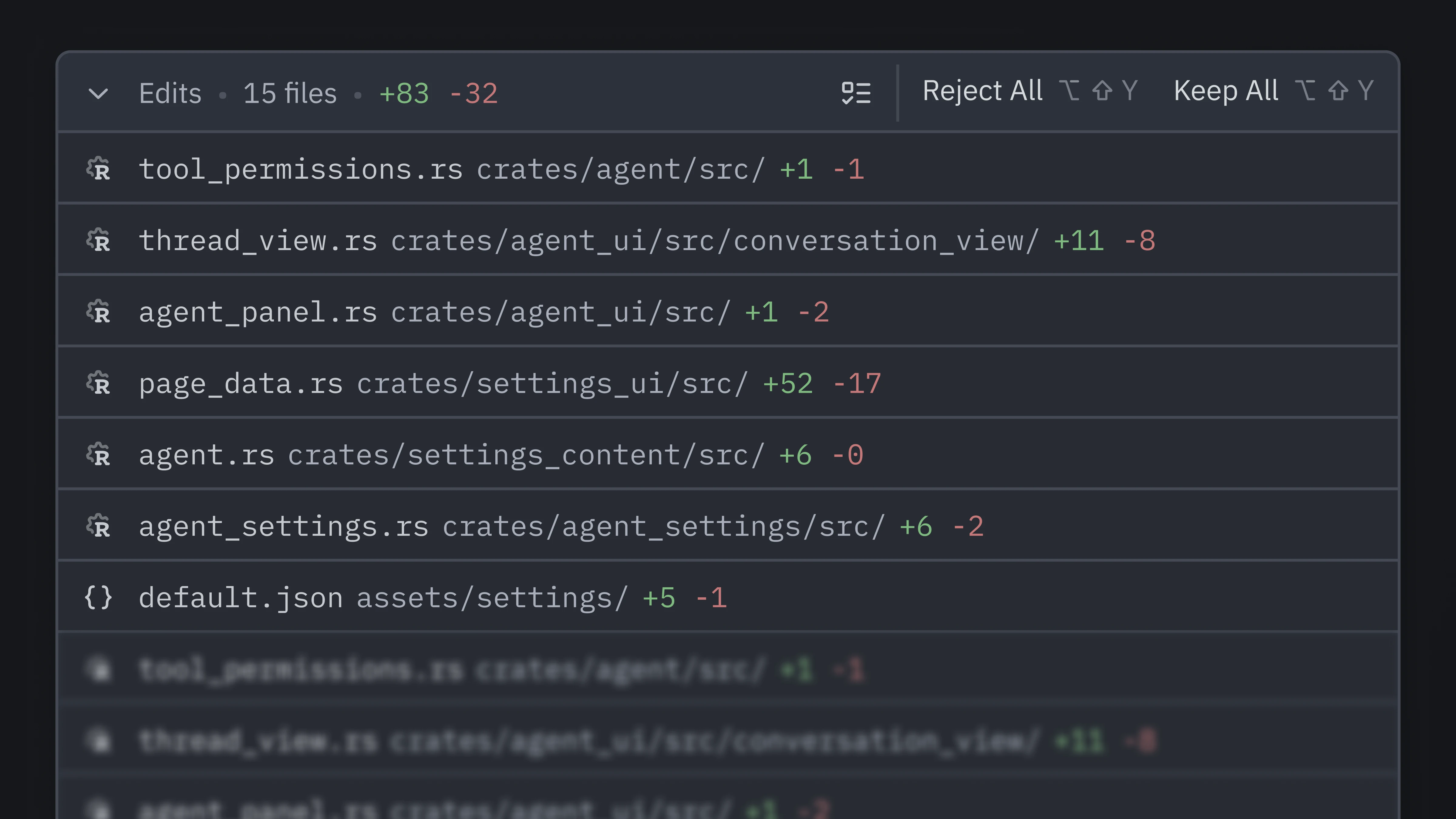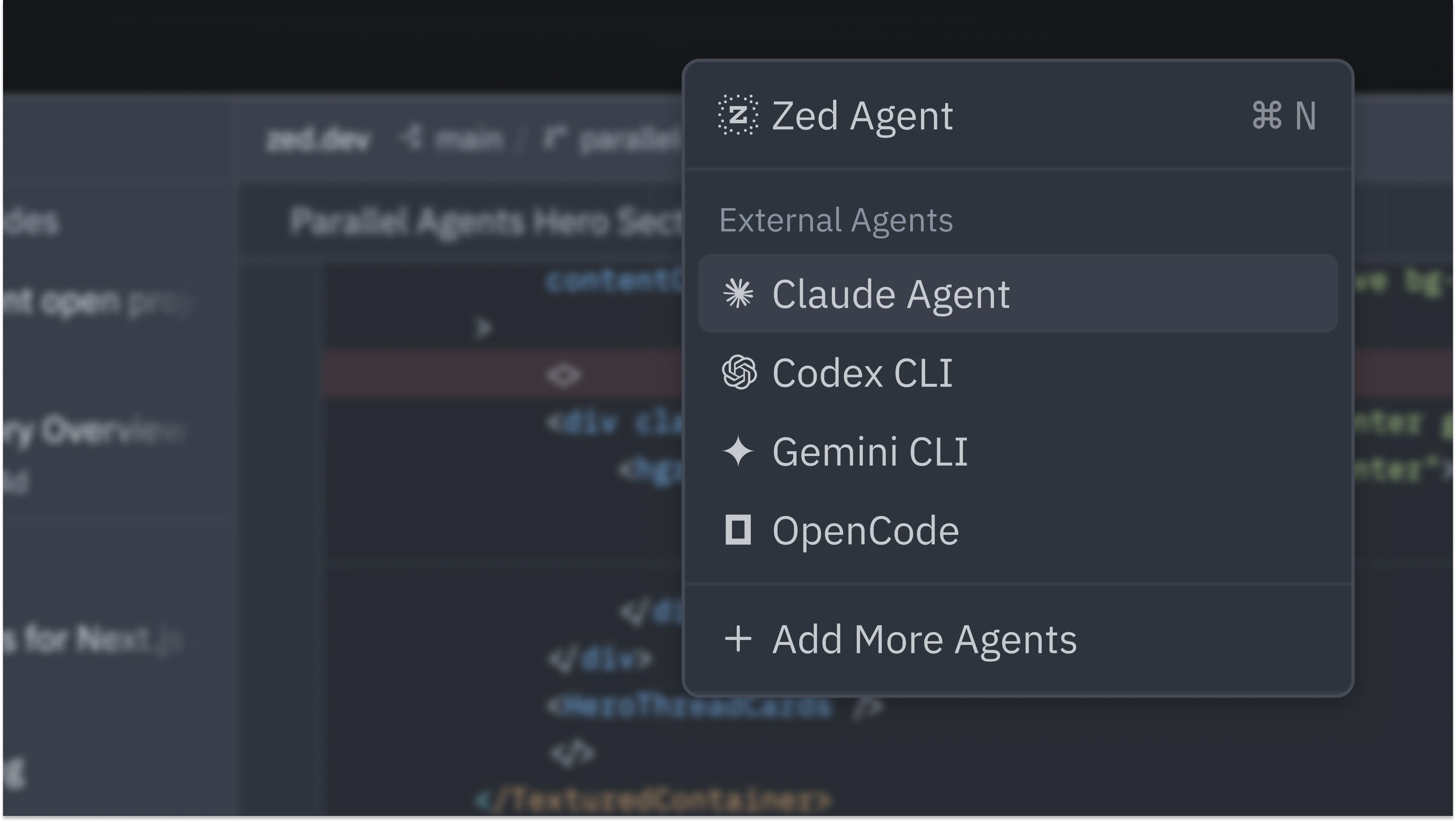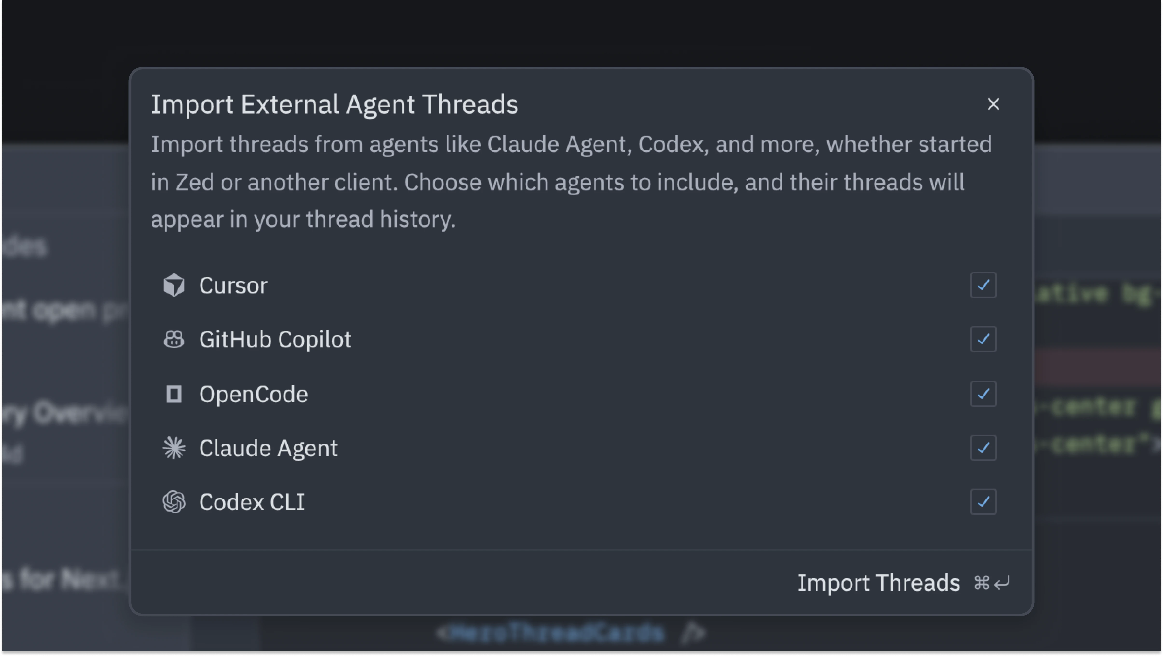 Bring any ACP-powered agent thread into Zed and continue where you left off.